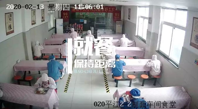 在今麦郎生产基地的食堂入口贴着一张提示,“吃饭之前先洗手,打饭吃饭不说话,同一方向向前看,间距相隔一米半。”十分醒目,整个餐厅干净整洁,消毒用品、洗手设施齐全。该公司还采取分批次就餐,适当延长就餐时间等措施,保证员工有一个安全、放心的就餐环境。