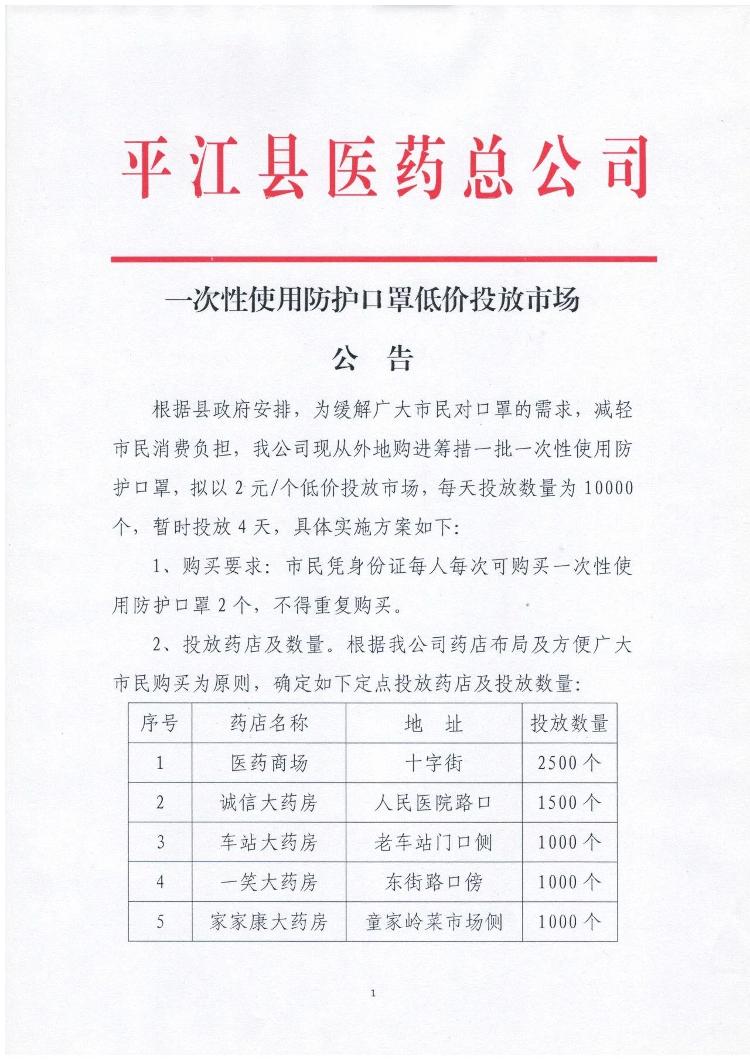 从2月26日至29日,为缓解广大市民对口罩的需求,县医药总公司将连续4天每天投放10000个共4万个,以2元/个的价格投放到市场,市民需凭身份证每人每次购买2个,不能重复购买。