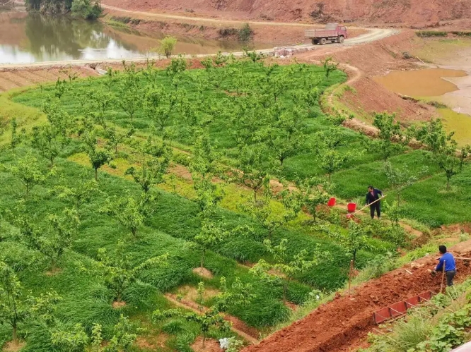 艾想东早先在报社干过,思想开阔,很健谈,他不用我们提问,主动摘要点向我们介绍。他们村引进的这个项目,利用村上的荒山、荒田、荒丘,由铖鼎源农业开发公司综合开发利用,不远的将来,这里将是集种养业、观光业、现代农业、休闲农庄等为一体的综合体。目前第一期工程正在紧锣密鼓建设。艾想东说:“村民大多在这里做工,特别是村里的贫困户更是优先。项目的引进,对巩固脱贫成效可起到至关重要的作用。”