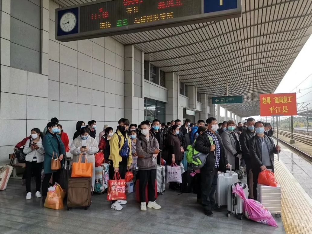 疫情期间,县人社局引导全县务工人员错峰出行,有序返岗。那天,与胡越良同行的,还有来自各乡镇的100名农民工伙伴,他们乘坐5辆专车,顺利抵达汨罗高铁站,踏上了南下广东的列车。那次行程,除了有县人社局的送工干部全程嘘寒问暖、一路同行,到达目的地后,当地人社部门也已替他们作好了周到安排。政民同心,干群并肩,不以山海为远,心连千里共好,这是疫情期间,平江县讲述的就业故事。