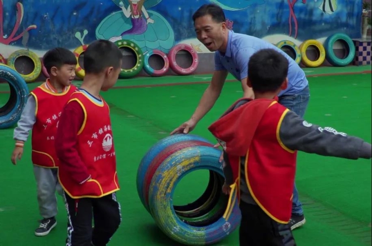 ▲黄海涛在新搬迁的幼儿园里带着孩子们玩耍。