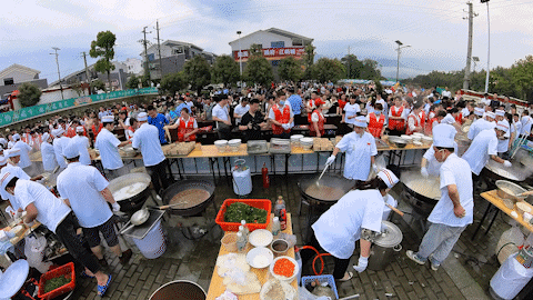 现场的厨师朋友们也不负期待,热锅、下面、浇汤......有条不紊地烹制着今天的主角。雨一停,就进入了翘首以盼的,“万人吃面”环节,在充足的准备下,一碗黄鳝面在8分钟左右就能端上桌。志愿者们一边维护现场的秩序,一边为吃货们分发面条,“大家不要急,每个人都有的吃!”“万人吃面”的现场被这醒目的红马甲,勾勒出一道文明的风景线。