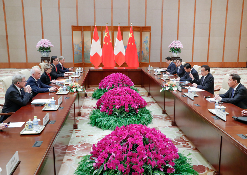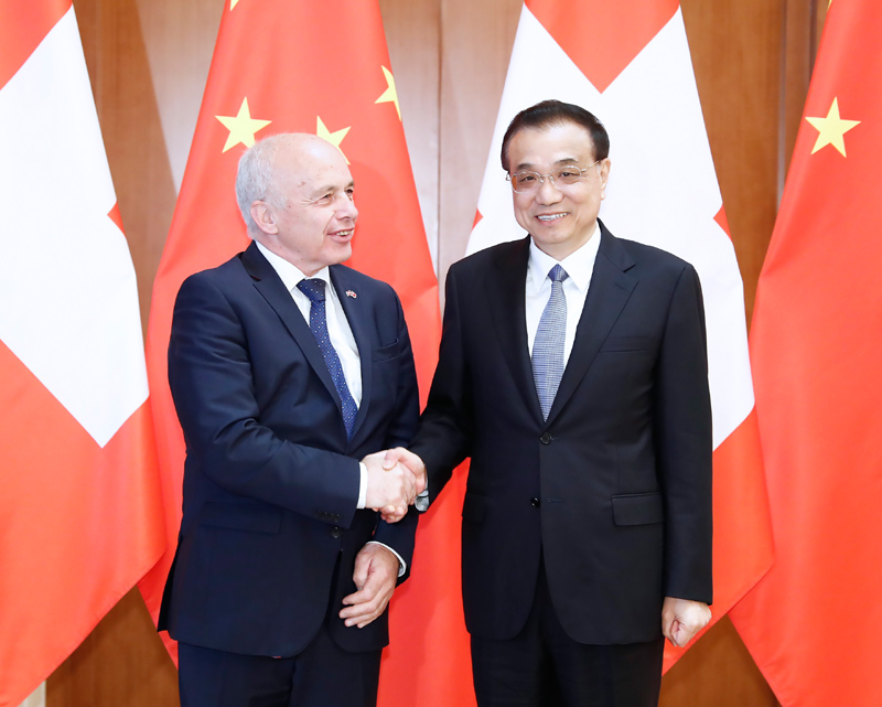 李克强表示,瑞士是最早承认并同新中国建交的西方国家之一,中瑞有着友好交往的传统。建交以来,中瑞关系在相互尊重、平等互利基础上不断向前发展。习近平主席将同主席先生举行会谈,为两国关系发展注入新的动力。我们愿同瑞方增进政治互信,加强高层交往,挖掘合作潜力,将“一带一路”倡议同瑞士发展战略对接,不断扩大双向投资,深化在高端制造、金融、科技、创新等领域的合作,通过扩大贸易规模实现经贸关系平衡发展,推动双方务实合作迈出新步伐。中瑞自贸协定对两国经贸关系发展起到了重要促进作用,瑞士企业已成为中国新一轮开放的受益者。中方愿同瑞方尽快开启自贸协定升级谈判进程。希望双方加强在中欧以及多边框架下的沟通协调,共同为世界和平和发展事业作出贡献。