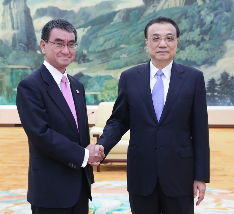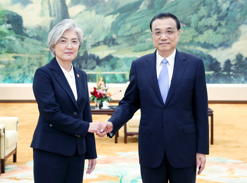 国务院总理李克强8月22日上午在人民大会堂会见来华出席中日韩外长会的韩国外长康京和、日本外相河野太郎。