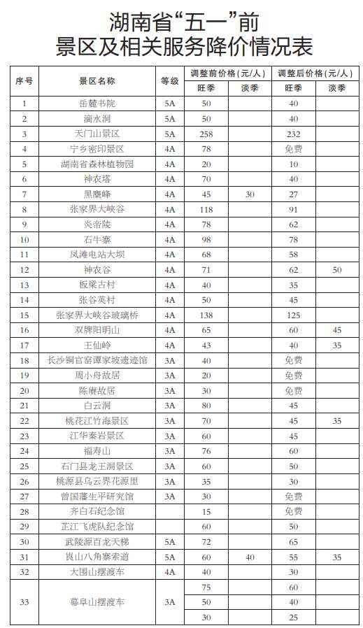 武陵源百龙天梯、崀山八角寨客运索道、大围山摆渡车、幕阜山摆渡车等4个景区的配套服务价格也将有5至15元不同幅度的降价。