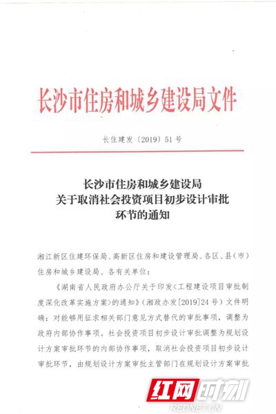 为进一步优化营商环境,推动工程建设项目行政审批制度改革工作,全力提升市场主体和办事群众的获得感,按照提高工作效率,精简审批环节,增强服务质量,切实为企业减负的要求,根据《湖南省人民政府办公厅关于印发<工程建设项目审批制度深化改革实施方案>的通知》文件要求,经报请长沙市政府同意,长沙市住建局印发《关于取消社会投资项目初步设计审批环节的通知》(长住建发[2019]51号),决定自2019年5月31日起,长沙市住房和城乡建设主管部门不再受理社会投资项目初步设计审批业务和出具审查意见。