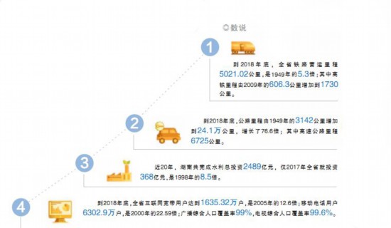 新中国成立70年来,湖南交通、水利、能源、信息网络等基础设施建设日新月异,日臻完善,成为三湘巨变的生动写照 ,更为三湘巨变提供坚实凭倚。