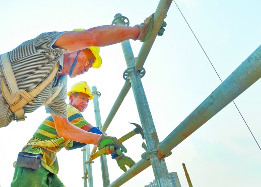 8月6日,长沙市岳麓区罗家嘴全互通立交桥改造工程现场,工人在搭建防护架。