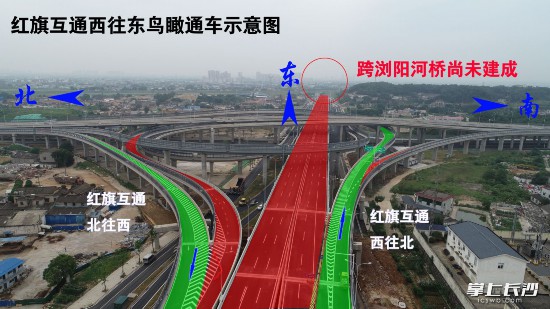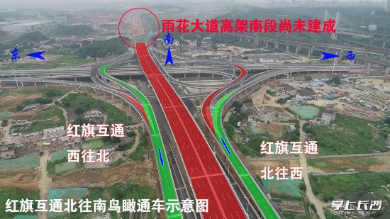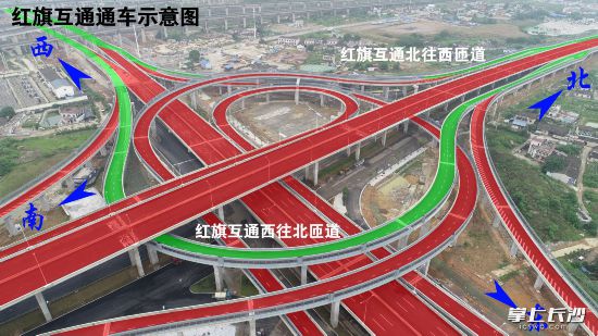 4.红旗路互通往东是即将启动建设的湘府路快速化跨浏阳河大桥项目,往南也是即将启动建设的红旗路高架桥项目,以上两个行驶方向本次暂不开通,请广大市民注意交通安全。