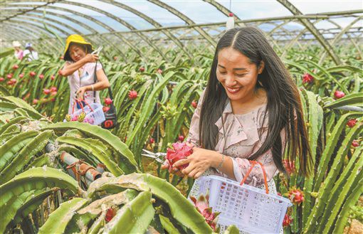 7月5日,道县梅花镇棠下村外婆家红心火龙果种植基地,游客在采摘火龙果。当天,该基地的火龙果正式开摘上市。由于管理到位及全部施用有机肥料,今年火龙果喜获丰收,吸引了不少游客前来采摘,并通过电商、直播带货销往全国各地。蒋克青 摄