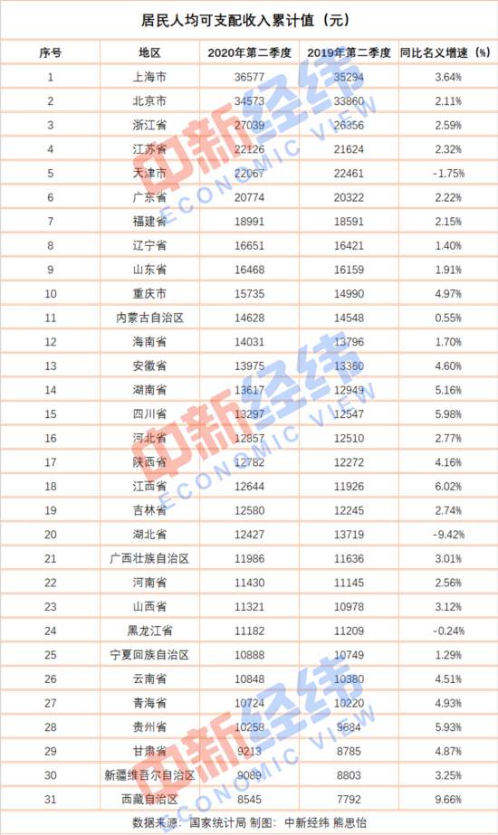 日前,国家统计局网站公布2020年上半年31省份居民人均可支配收入显示,上海、北京人均可支配收入突破3.4万,另有8省份上半年人均可支配收入超全国平均线。