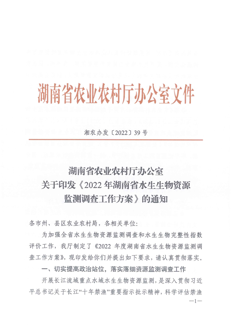 附件:《湖南省农业农村厅办公室关于印发〈2022年湖南省水生生物资源监测调查工作方案〉的通知》