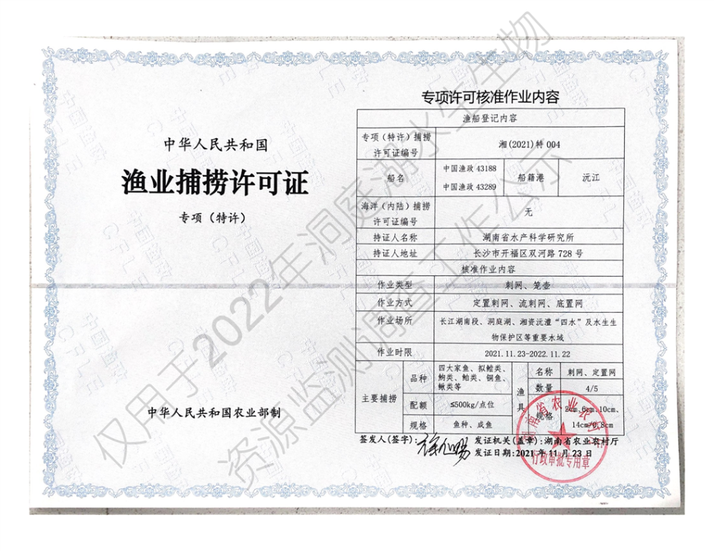 为贯彻落实《农业农村部办公厅关于加强和规范长江流域水生生物监测调查工作的通知》(农办长渔〔2021)2号)及长江“十年禁渔”相关文件精神,进一步强化渔业资源监测评估工作,为长江水生生物资源养护、珍稀濒危水生动物保护、生态环境修复等工作的开展提供技术支撑。根据农业农村部长江流域渔政监督管理办公室相关要求,经省农业农村厅批准,由省水产科学研究所在汨罗江平江段组织开展科研特许捕捞活动,现将有关情况公告如下: