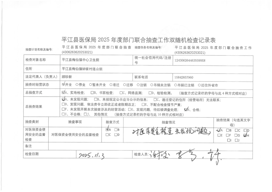 平江县医疗保障局2025稽核检查中心双随机一公开抽查事项清单