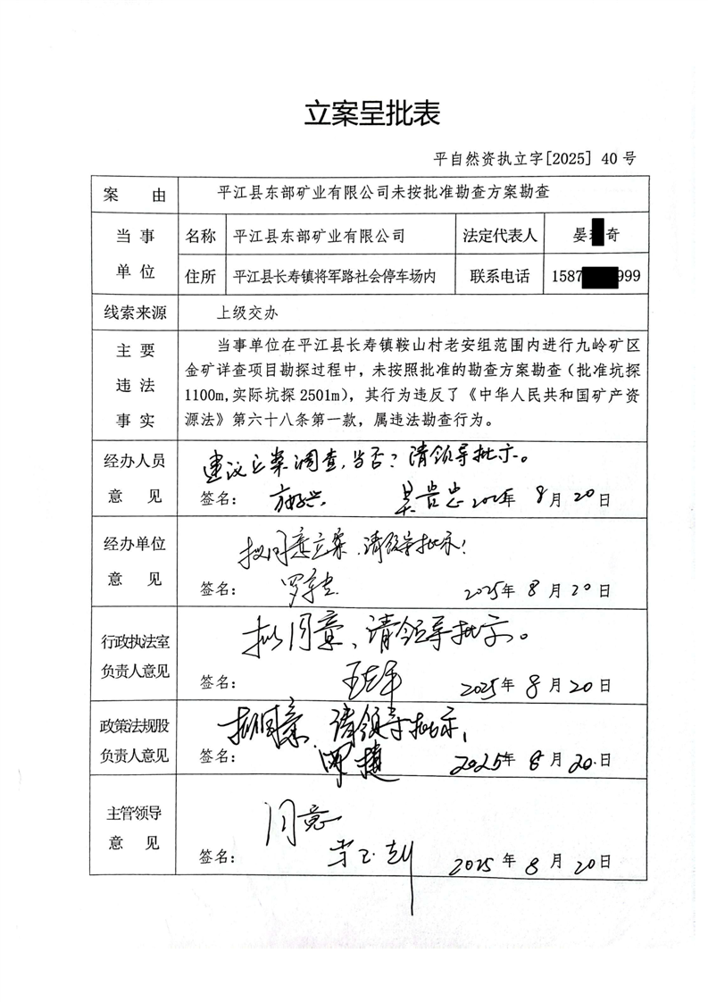 平江县东部矿业有限公司未按批准勘查方案勘查