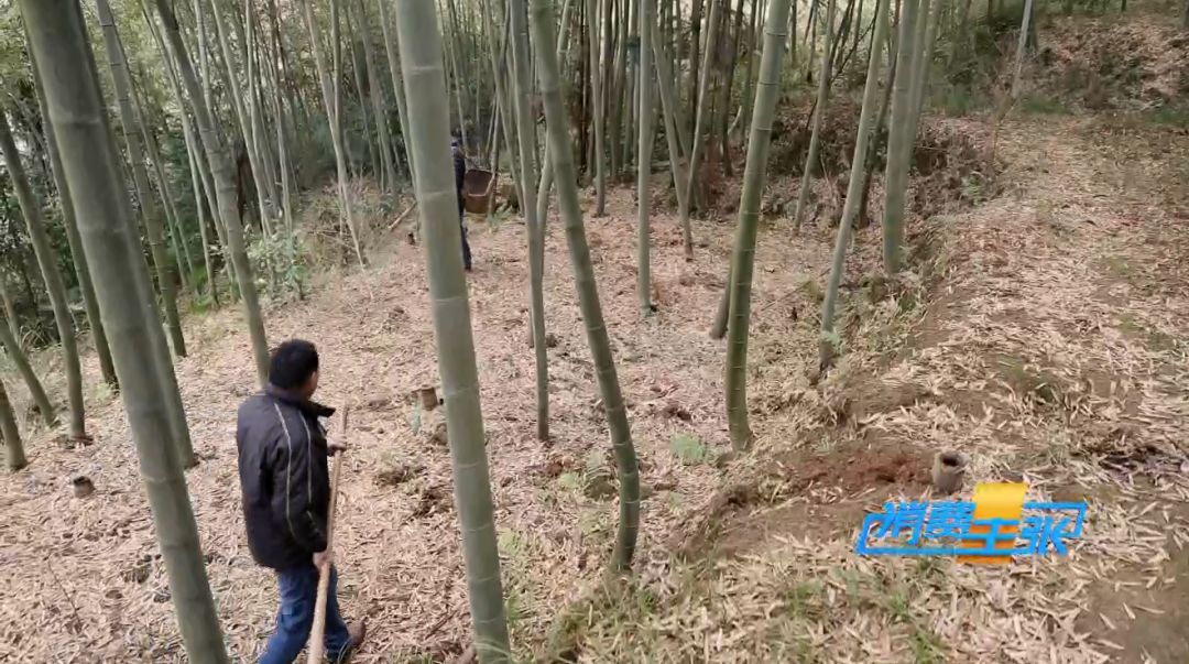 一大早,村民余彪就和朋友邱恩来拎着锄头,背着竹筐进山了,他们要去挖冬笋。余彪从小就在周边的山上挖冬笋,哪里有冬笋他都知道,无奈今年天气干旱,山上的冬笋很少也很难找。换了一片竹林后,余彪发现了目标。