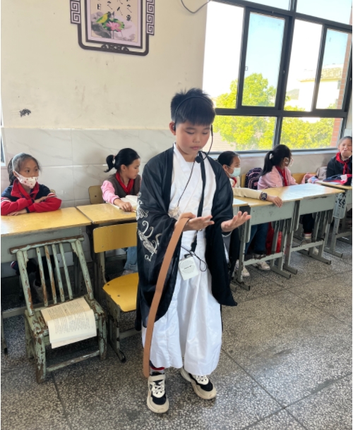 “双减”政策落地后,孩子们的作业做了“减法”,但教学质量不能做“减法”。为了提升语文课堂教学质量,五年级的张阳老师着力课堂教学设计,创设了学生“自助”课堂。“民间故事”是五年级语文第三单元的授课内容,张老师让学生自编剧本,采取学生自导、自演、自评的模式,让学生在活动中理解故事内容。“民间故事会”开展前,张老师和孩子们做了准备工作:通过师生共同阅读确定好“故事会”所展示故事内容。没有道具,学生就借来了爸爸的皮带当“赶山鞭”。