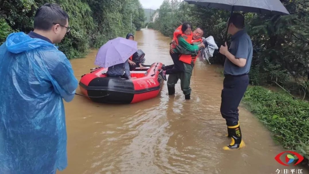 ▲7月1日,党员干部在转移救援汨罗江边群众