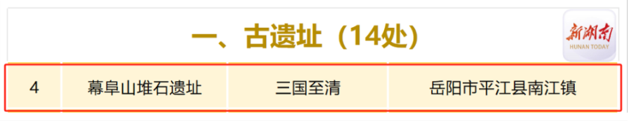 近日,湖南省人民政府发布《关于公布第十二批省级文物保护单位名单的通知》,核定公布219处省级文物保护单位。其中,平江共新增7处,分别是幕阜山堆石遗址、黄泥湾大屋、金华吴氏家庙、大石板屋场、哲寮湛氏宗祠、普庵寺摩崖造像、喻杰故居。