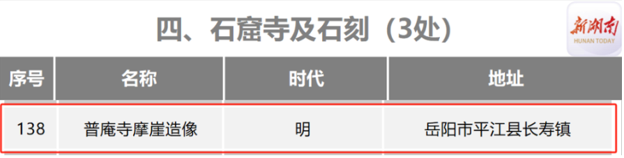 普庵寺摩崖造像位于长寿镇鞍山村狮子岩北壁,窟内有三尊佛造像,均端坐在莲花座上,佛像高约75~80cm,明显有多次抹灰塑身着彩痕迹。从石窟上留刻的铭文得知,普庵寺摩崖造像开凿的年代为明洪武二年(1369),是湘东北地区目前发现唯一石窟类文物,虽部分风化剥蚀,但其整体造型和风格仍保留相对较好。同时,石窟及其所依附的寺庙建筑样式、建筑风格等,仍是湘东北地区至今寺庙建筑传承的样本,具有较高的历史、艺术和科学价值。