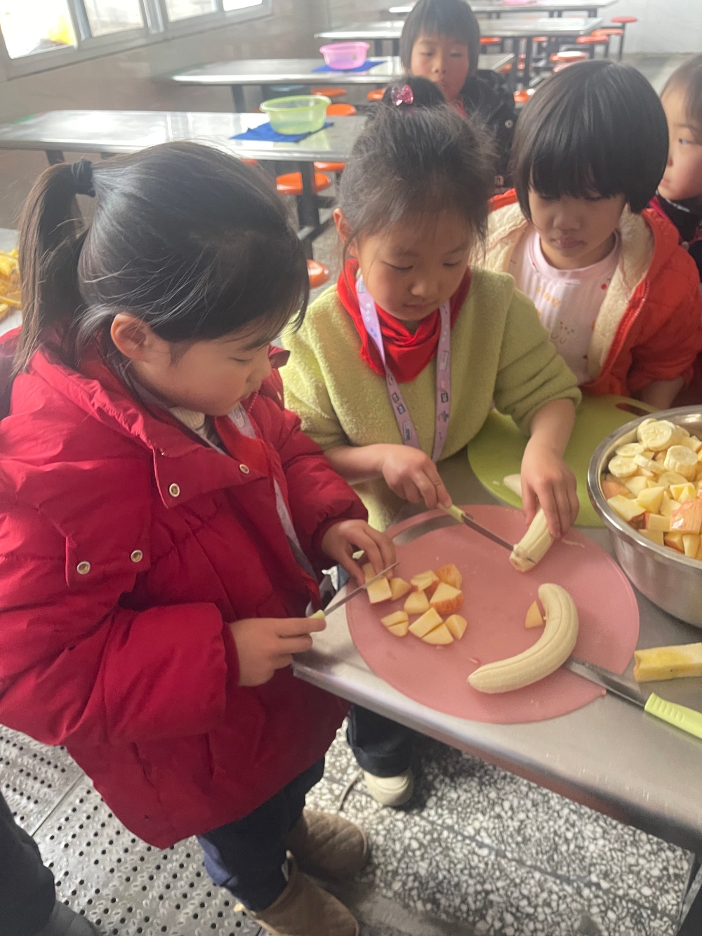 在老师的一声令下,各小组迅速行动起来。苹果、香蕉、火龙果在孩子们的手中变成了形状各异的小块,红彤彤的苹果块、黄澄澄的香蕉片、紫红鲜艳的火龙果丁,色彩斑斓地摆满了桌面,宛如一幅绚丽的水果画卷。接着,大家小心翼翼地挤上香甜的沙拉酱,齐心协力搅拌起来,香甜的气息瞬间弥漫整个食堂。