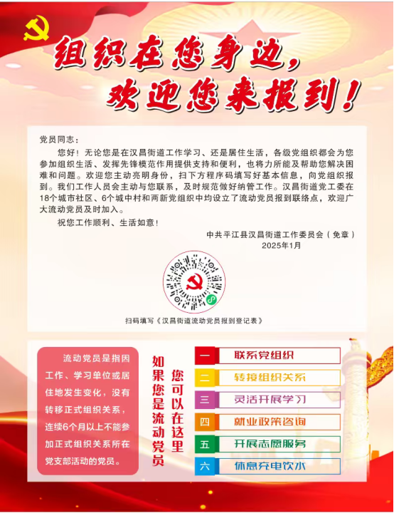 现在的汉昌街道,有着越来越多的流动党员正从“漂泊游子”成长为“反哺先锋”,从“异乡过客”蜕变为基层治理的“中坚力量”。面对新业态从业党员持续增多的新形势,街道将进一步加强教育管理、优化服务供给、整合驿站资源,全力推动这支“红色生力军”在基层治理一线扛重担、显担当。同时,积极引导流动党员为家乡发展建言献策,争当返乡创业的“排头兵”,让流动的党徽在奋斗与奉献中熠熠生辉。