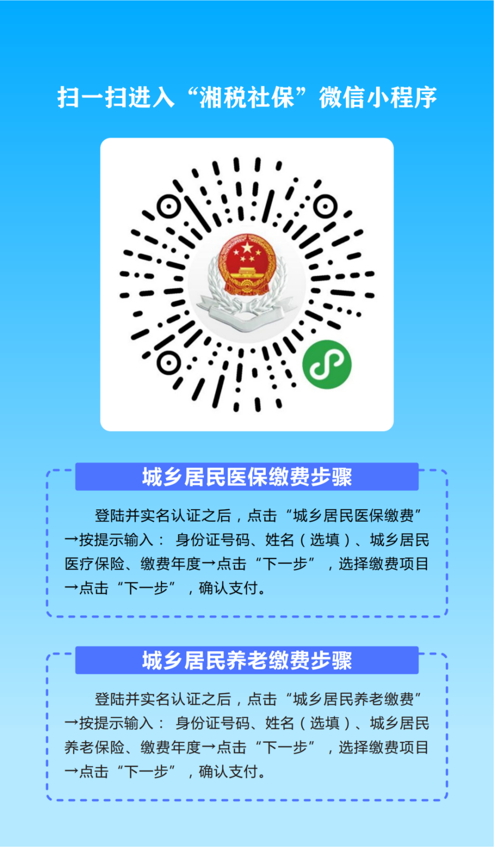 温馨提示!打开微信扫码缴费,认准“湘税社保”微信小程序。