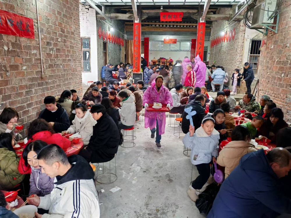 农历除夕,梅仙镇万谷村杨树里热闹非凡。何、李、张、钟、彭、秦、徐七姓共369位乡亲欢聚一堂,以一场盛大的团圆宴共迎新春。