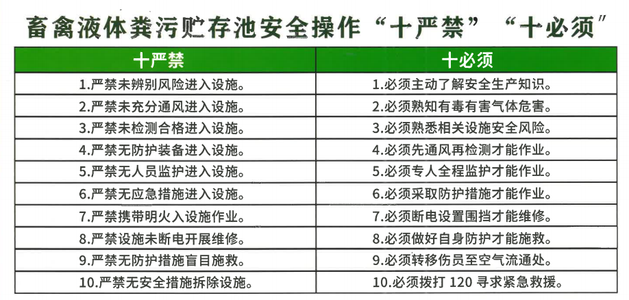 近年来,我省部分地区陆续发生的几起疑似沉淀池沼气中毒事件,给我们一次次敲响了安全的警钟!因此,发展养殖业同时,畜禽粪污设施安全生产也密切关联到我们每个养殖户的生命财产安全。平江县畜牧水产农机事务中心针对畜禽液体粪污贮存池安全隐患,聚焦防中毒、防缺氧、防淹溺、防火、防爆等关键安全要素,强化安全运行措施,提高规范处理水平,消除安全生产隐患,特提醒广大养殖场(户)做好畜禽液体粪污贮存池安全生产工作,坚决遏制重特大事故,切实维护生命财产安全。