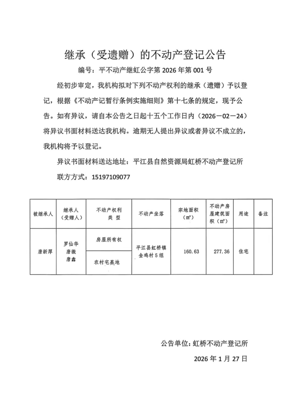 虹桥镇金鸡村罗仙华,唐微,唐鑫不动产受继承首次登记公告