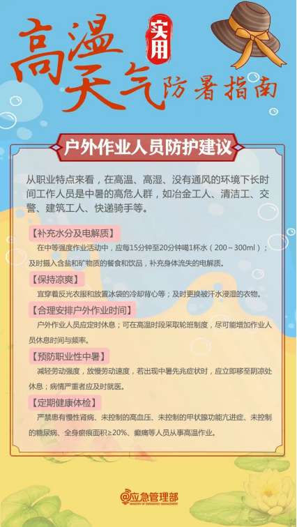 为帮助大家科学应对高温天气,有效预防中暑,特附上由应急管理部发布的《高温天气实用防暑指南》,一起学习防暑知识,守护身心健康: