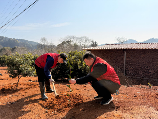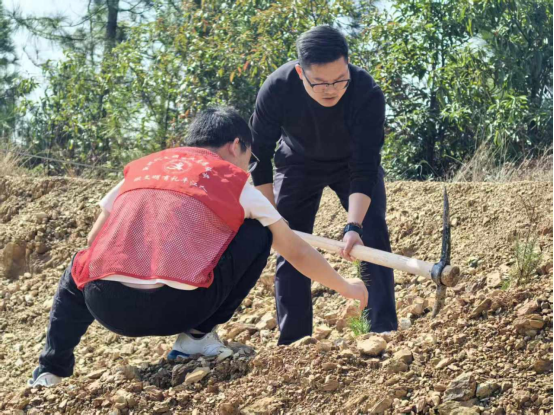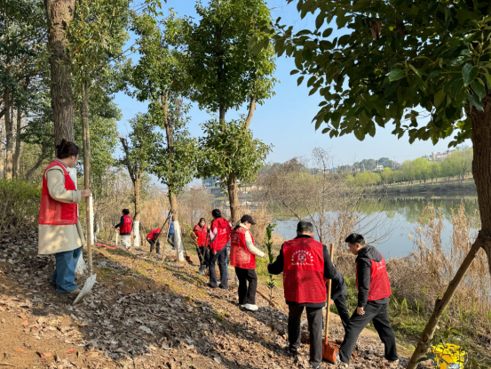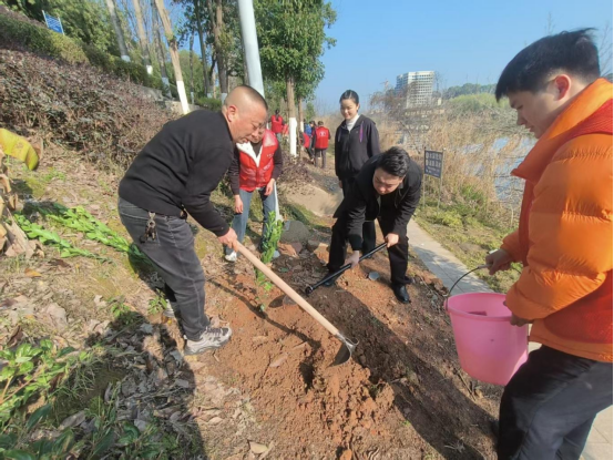 在县新时代文明实践中心的指导与街道统一部署下,400余名参与者化身“红马甲”志愿者,挽袖持锹,奔赴汨罗江沿岸、社区闲置地块及荒山坡等预先勘选的区域。现场分工有序:挖坑者挥锹破土,扶苗者悉心安置,填土者覆土夯实,浇水者往来奔波。汗水浸湿鬓发,笑意盈满眼眶——这抹“志愿红”与破土新绿交织,构成了春日里最为动人的风景。