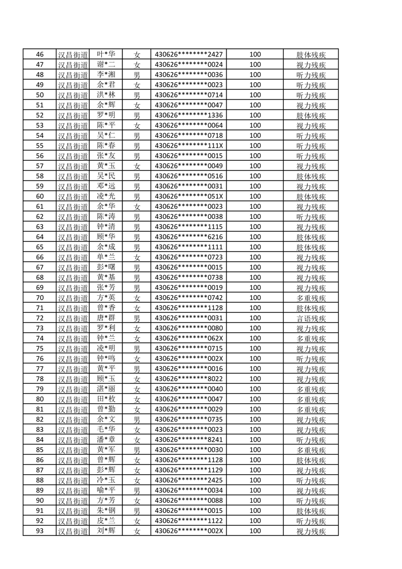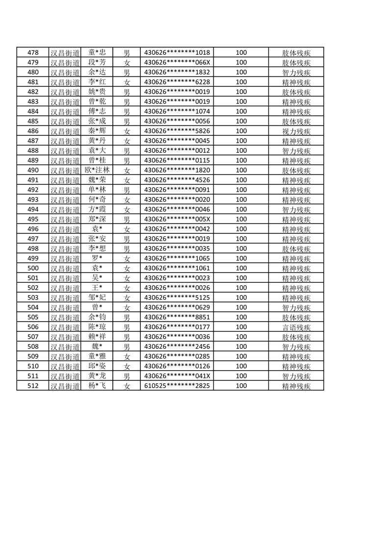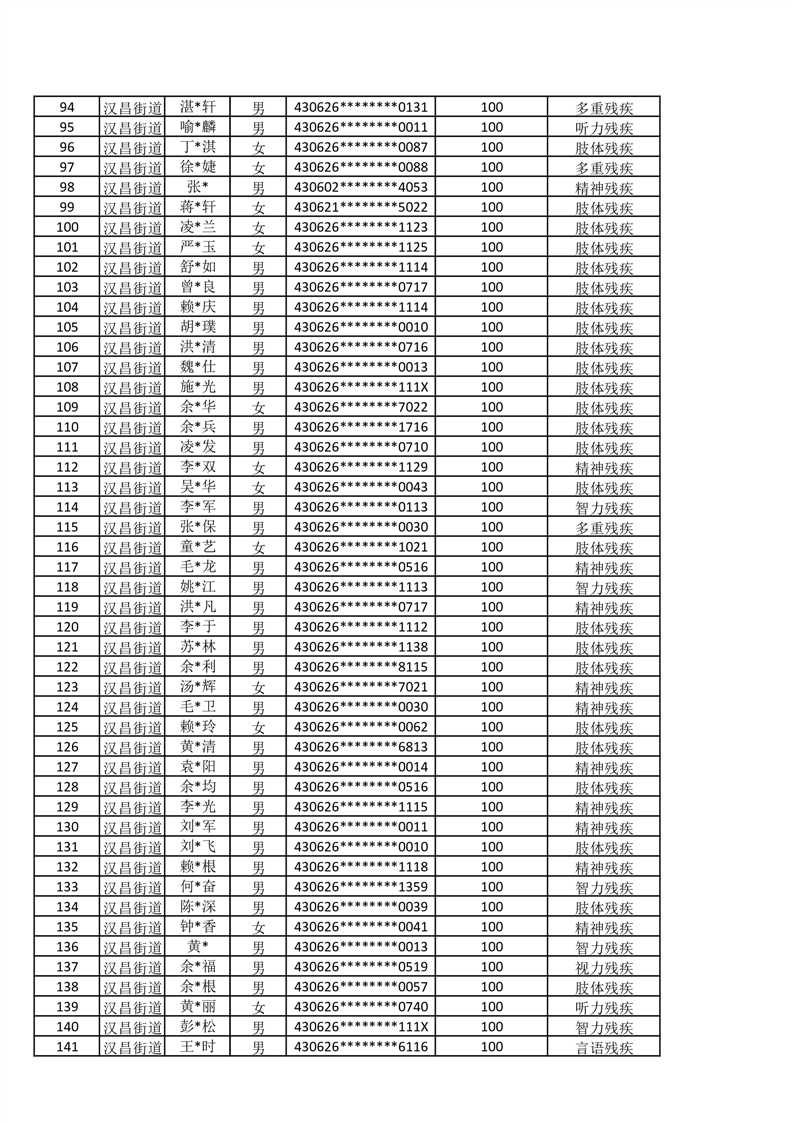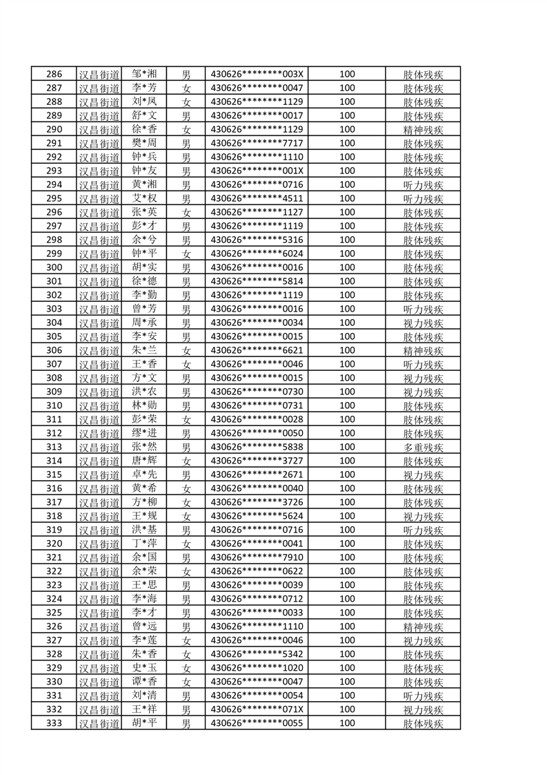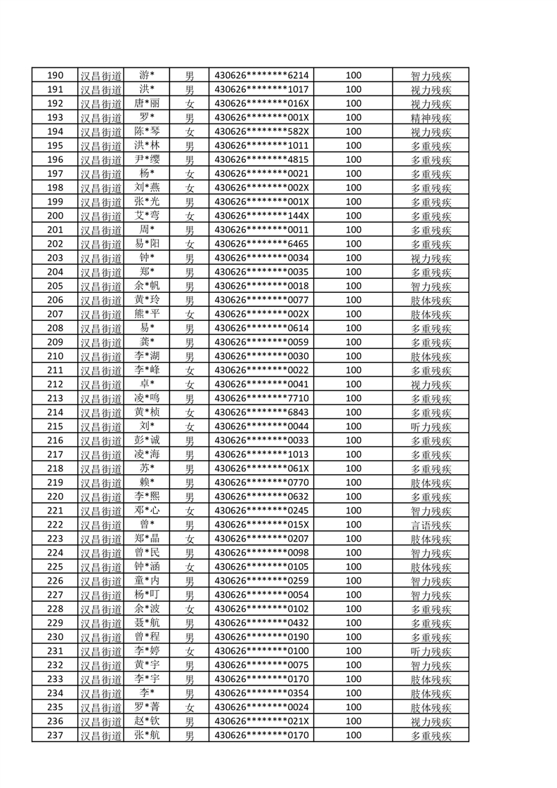 汉昌街道2025年10月份困难残疾人生活补贴发放名册