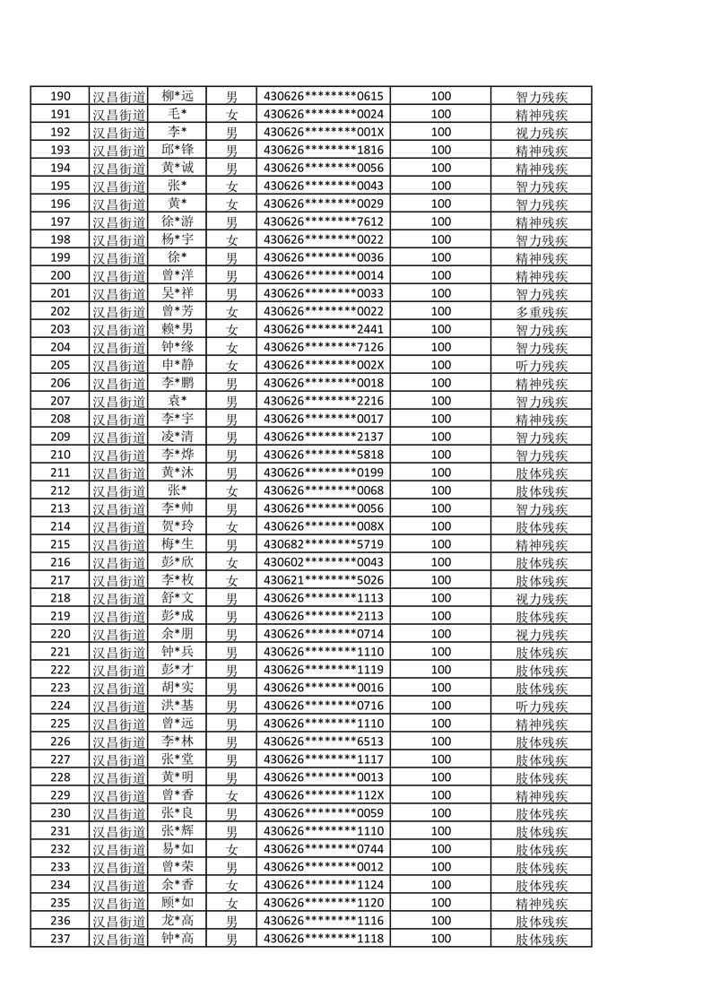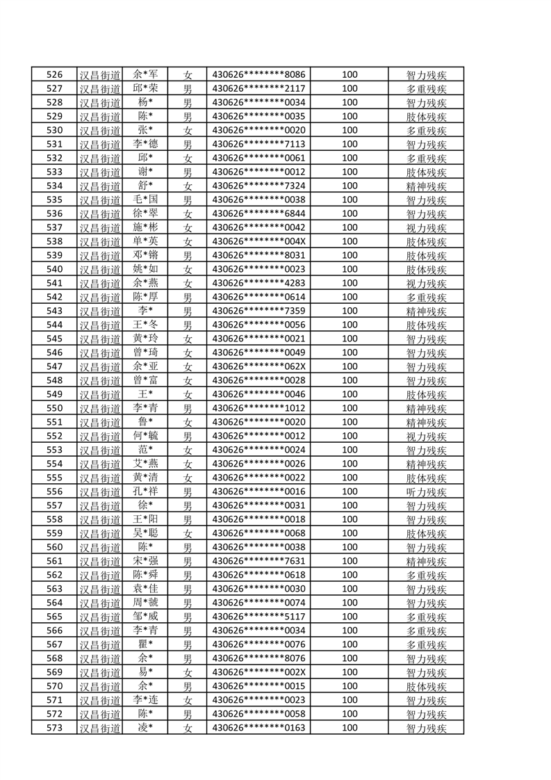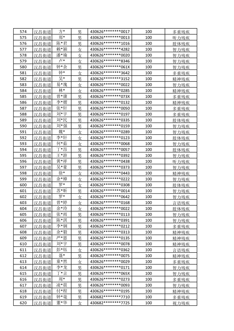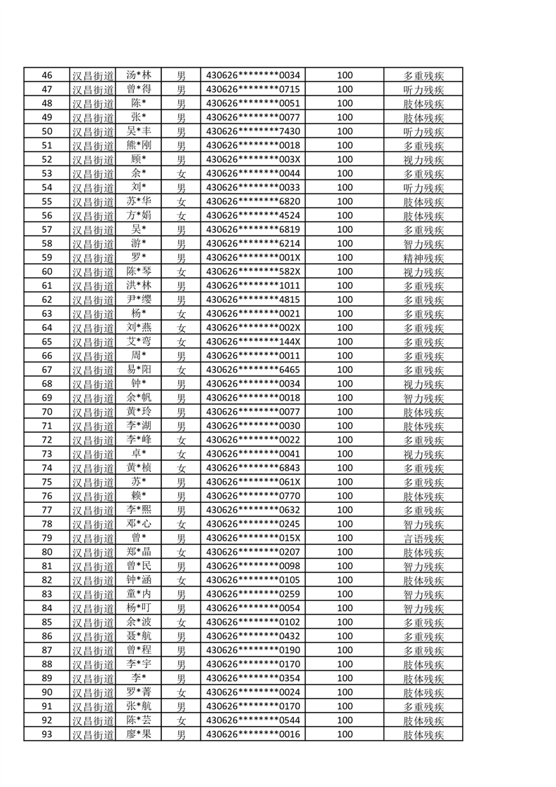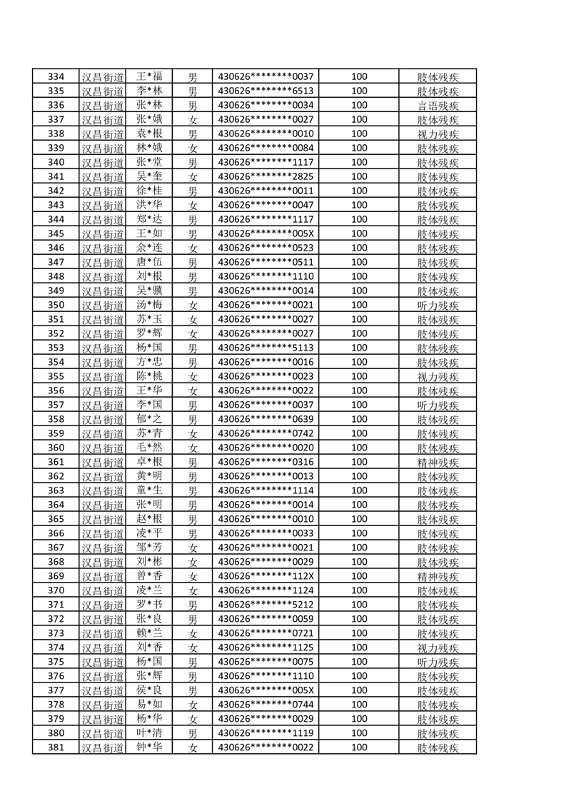 汉昌街道2025年10月份困难残疾人生活补贴发放名册