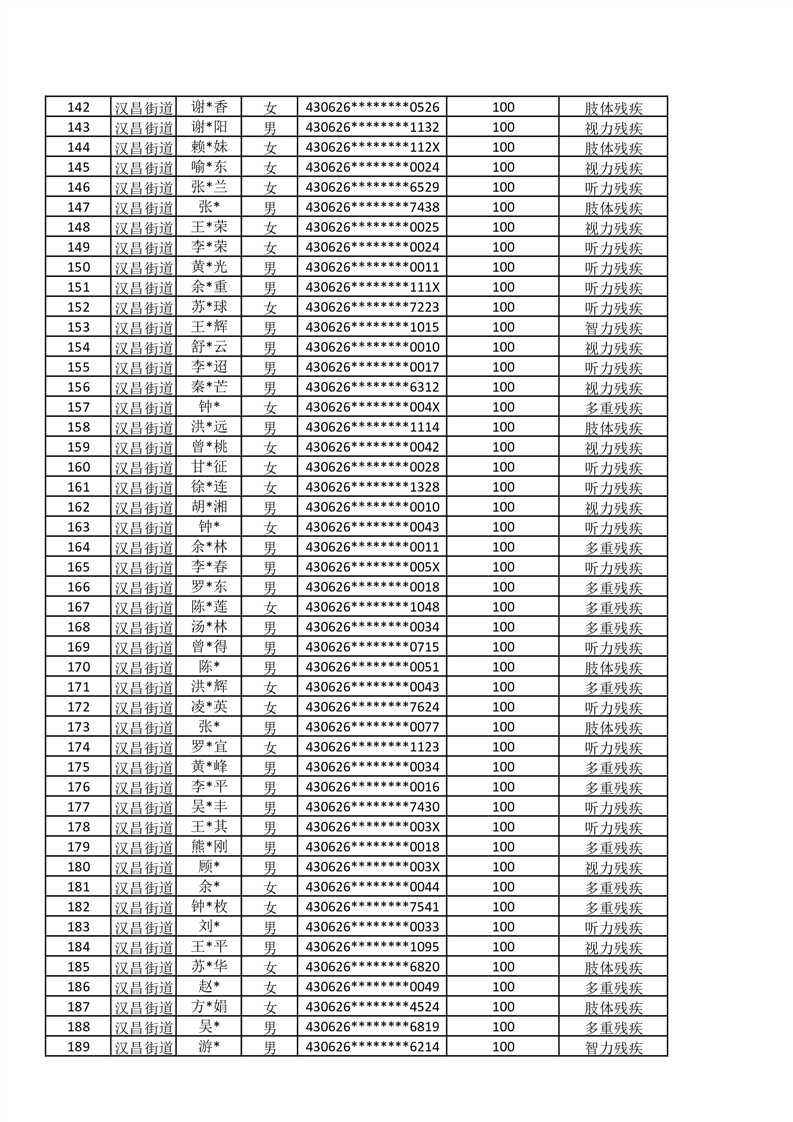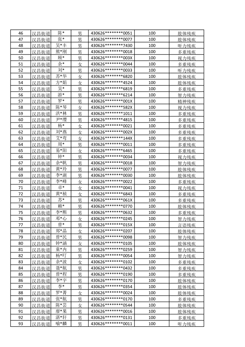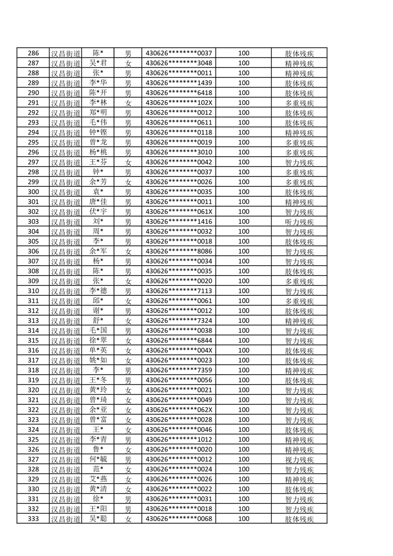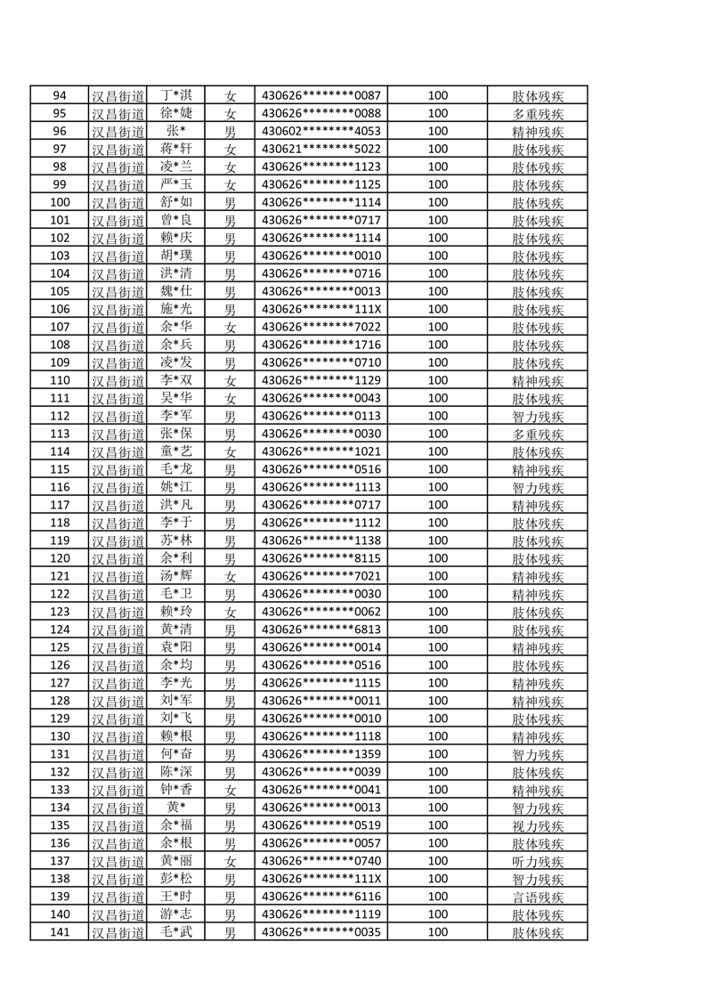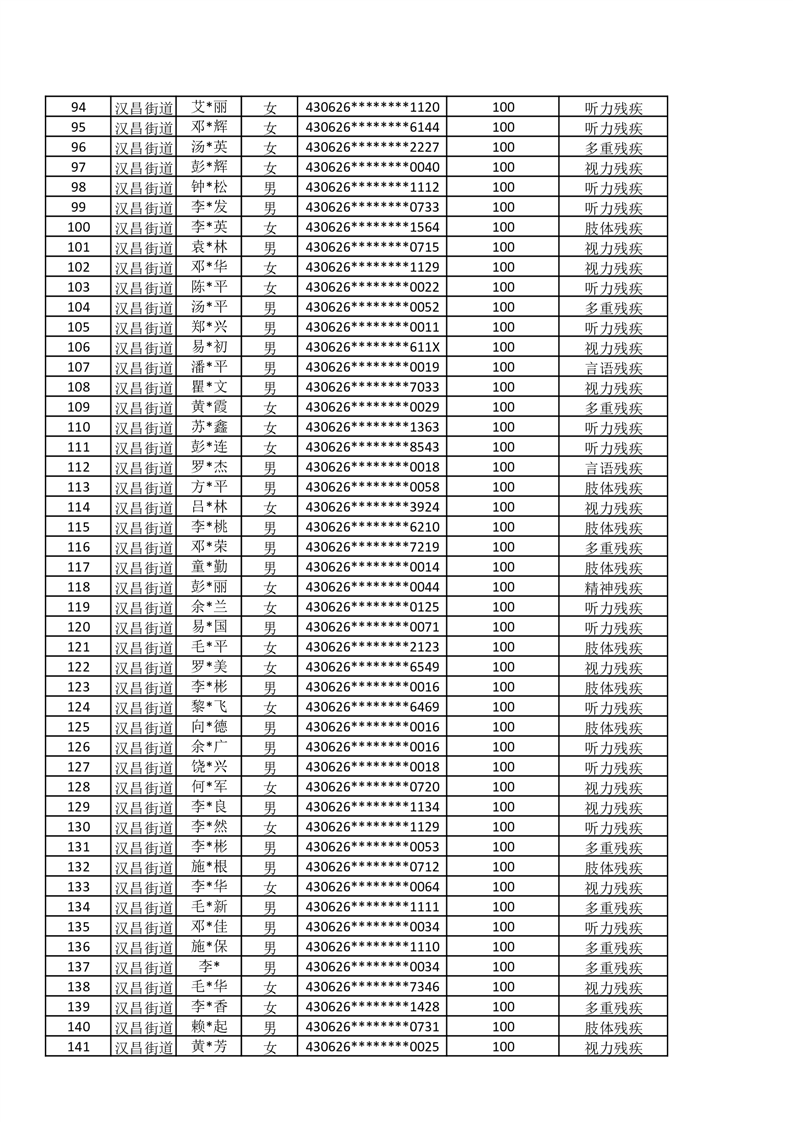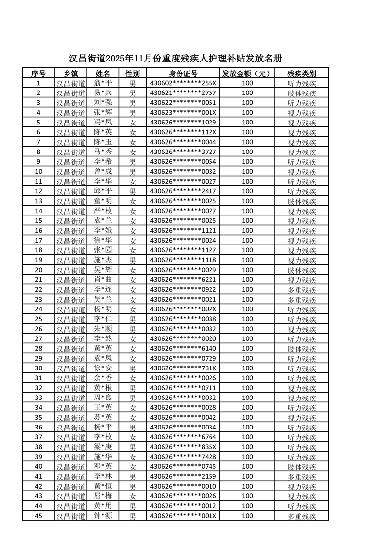 汉昌街道2025年11月份困难残疾人生活补贴发放名册
