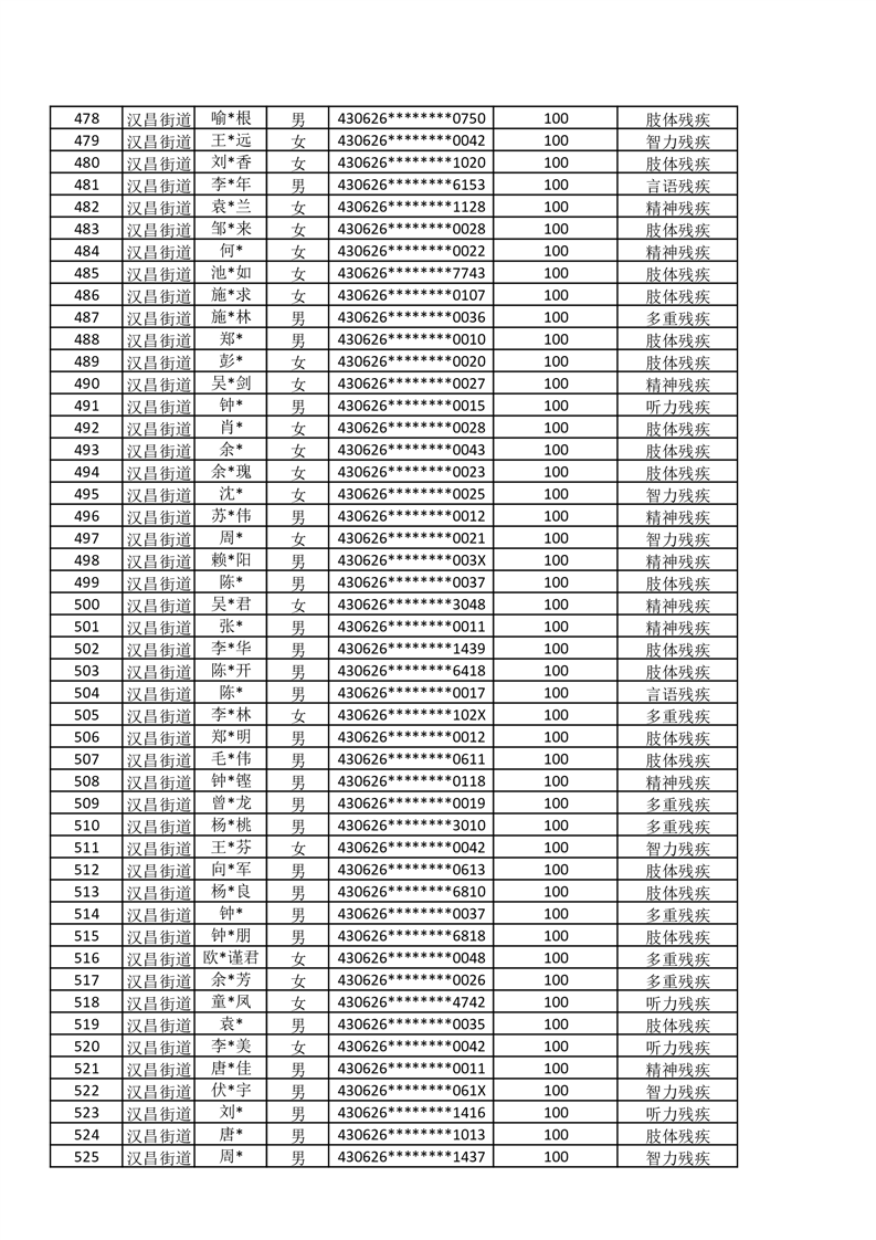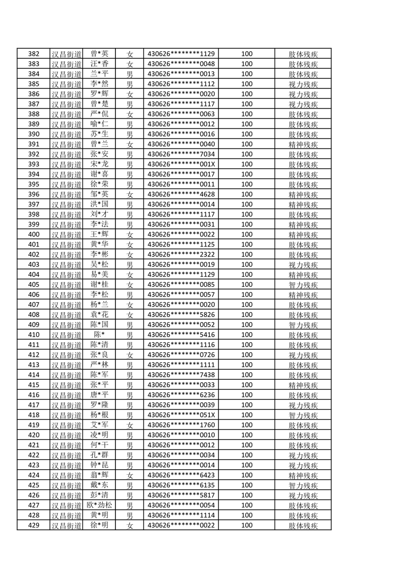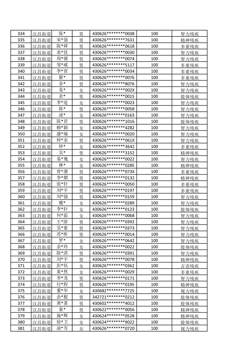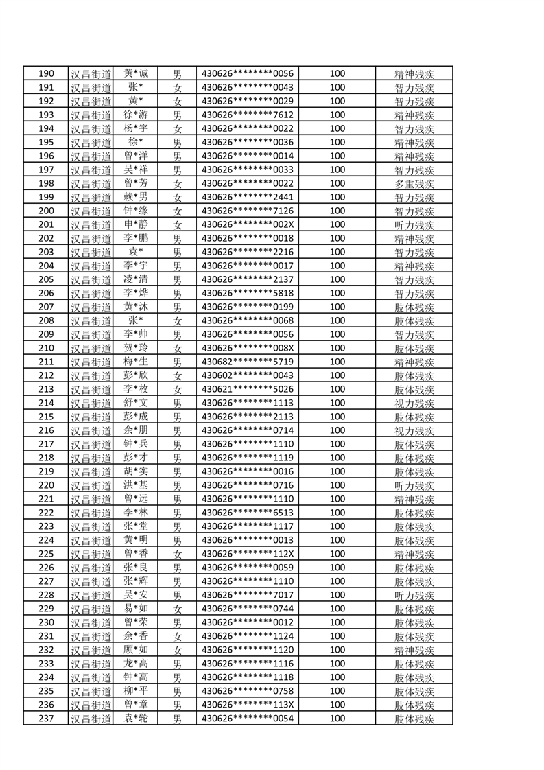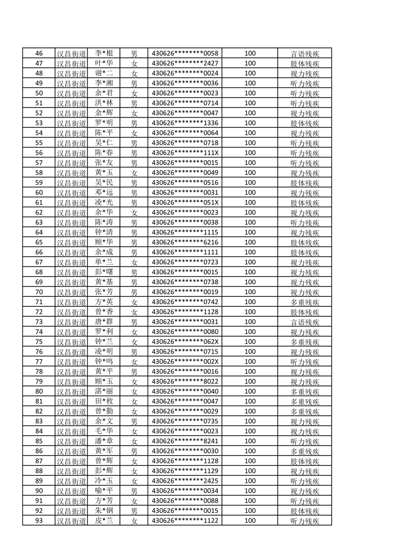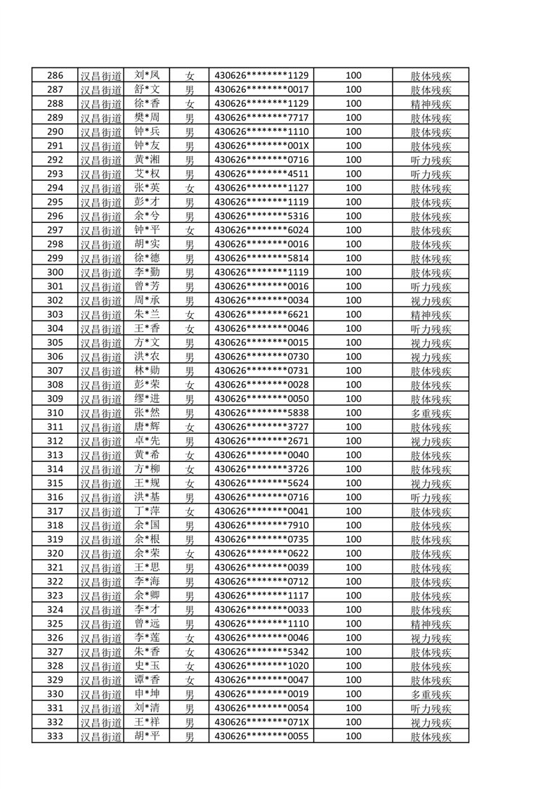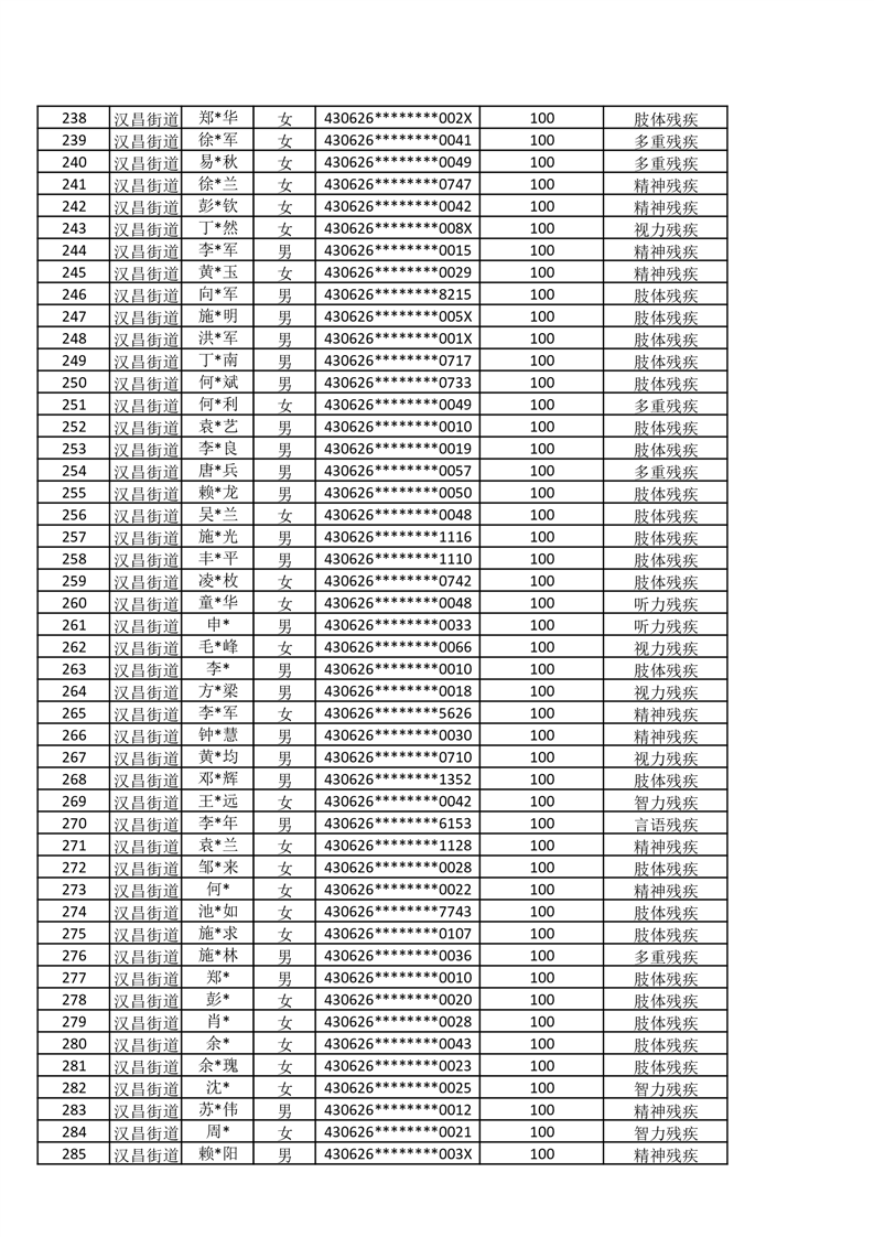汉昌街道2025年11月份困难残疾人生活补贴发放名册