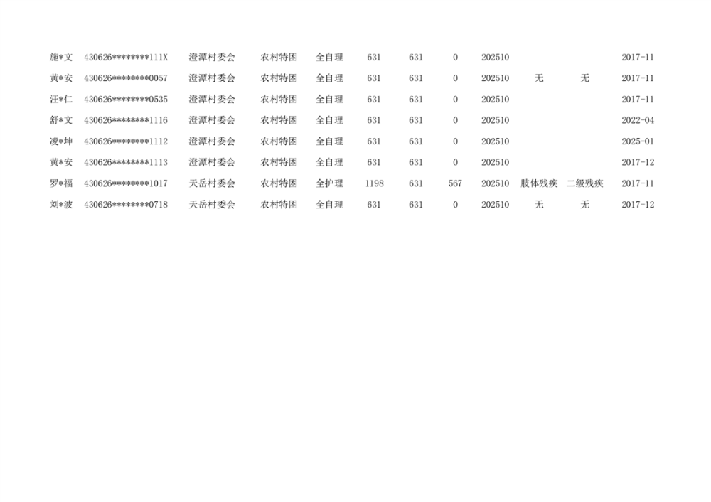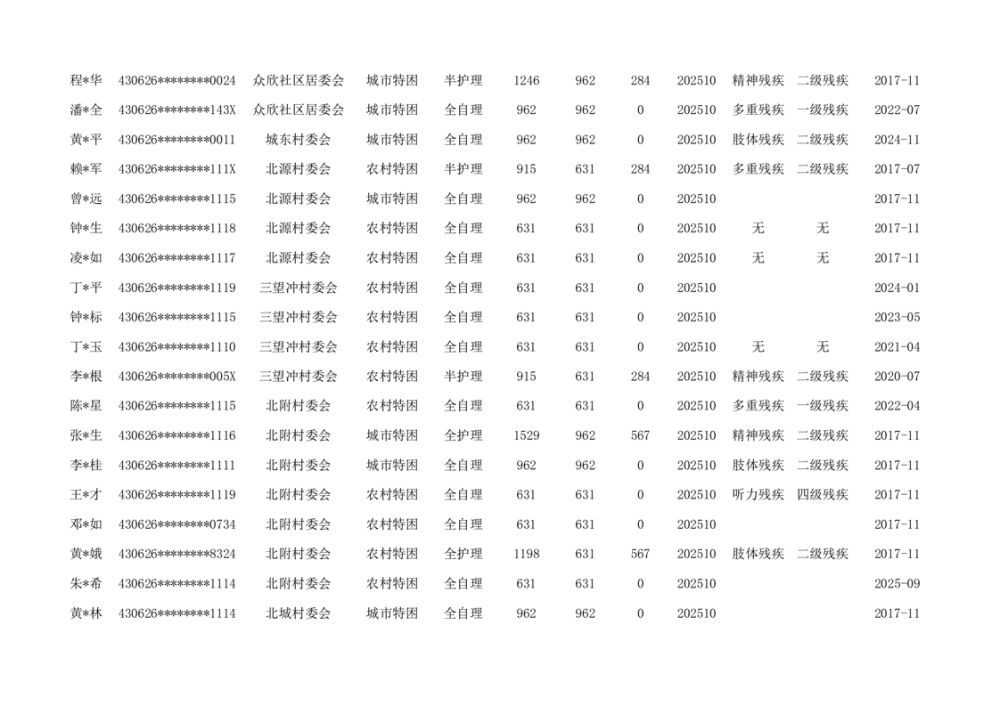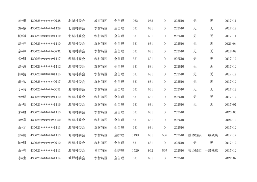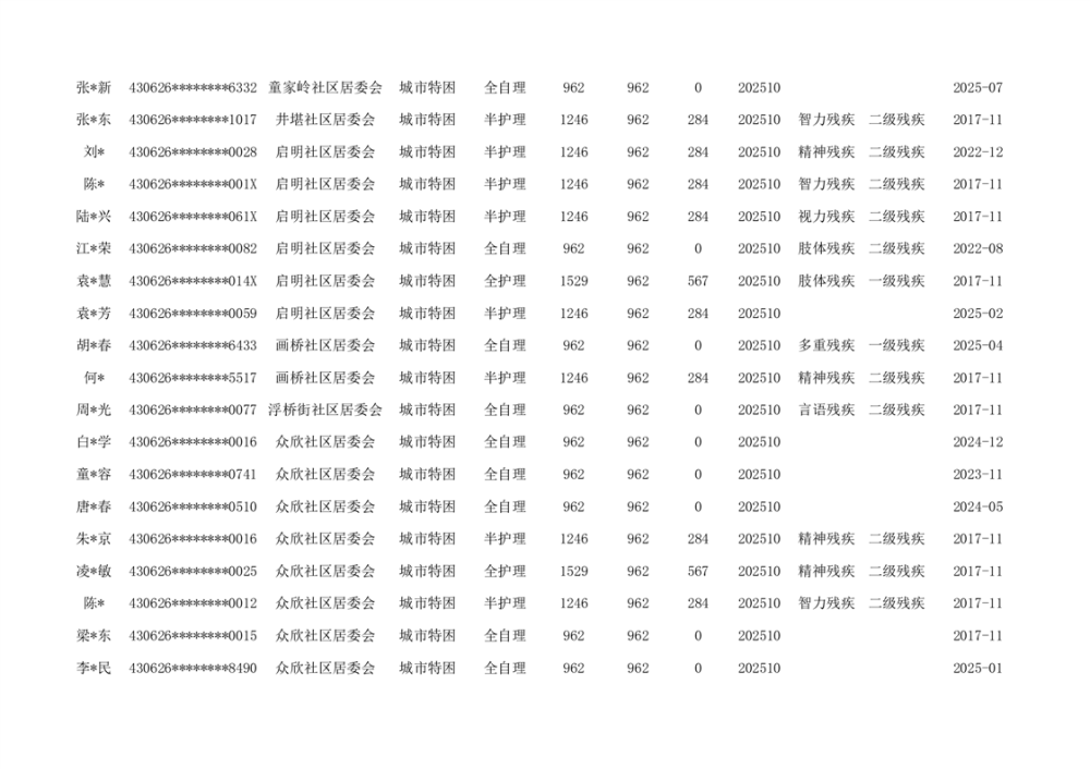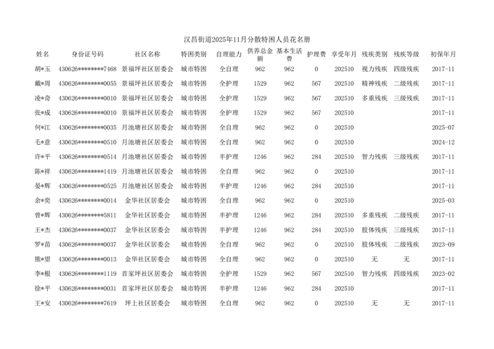 汉昌街道2025年11月分散特困人员花名册
