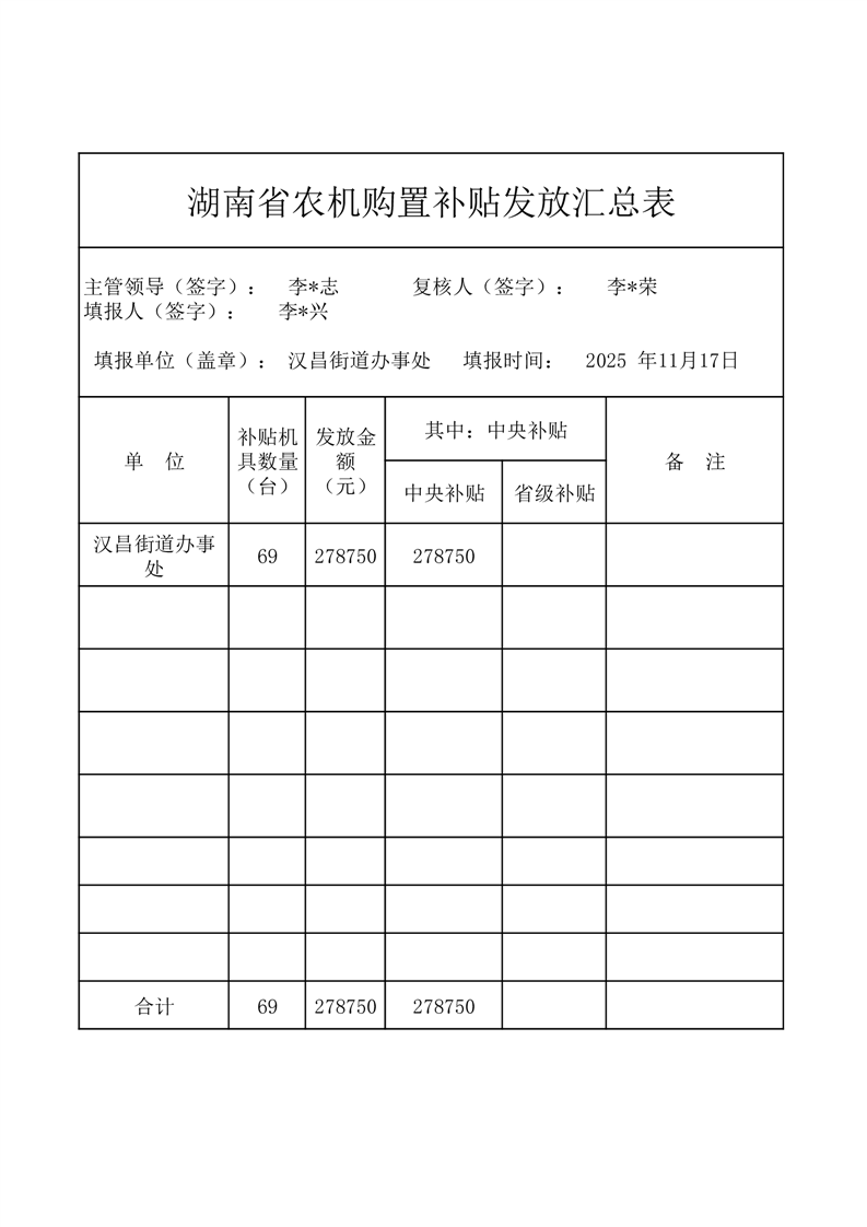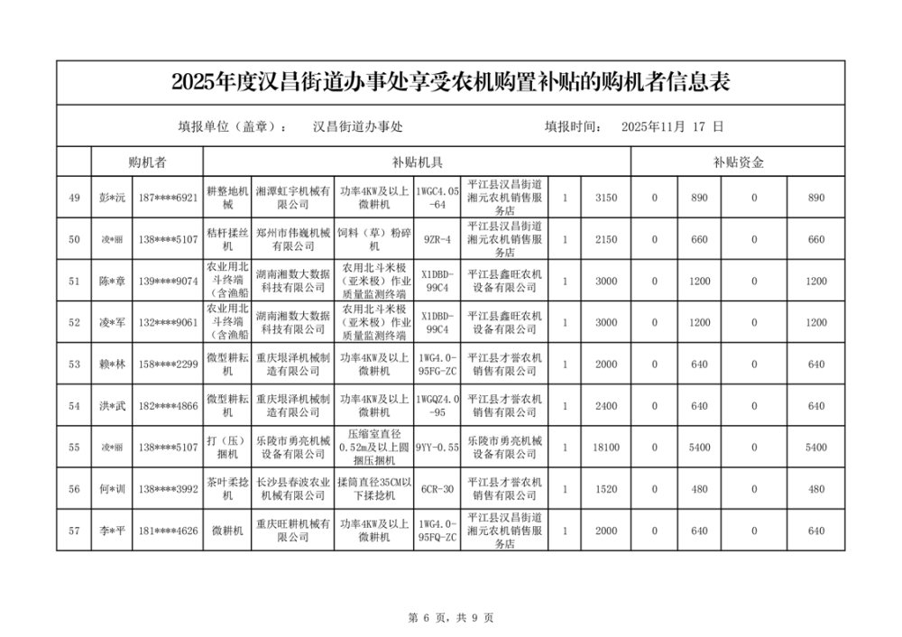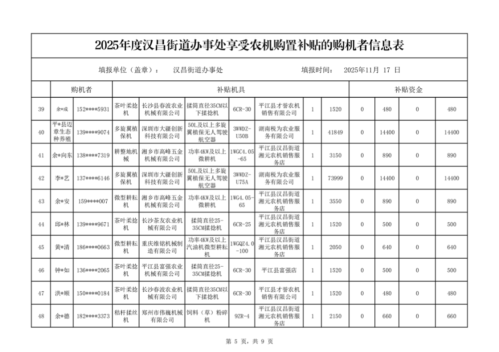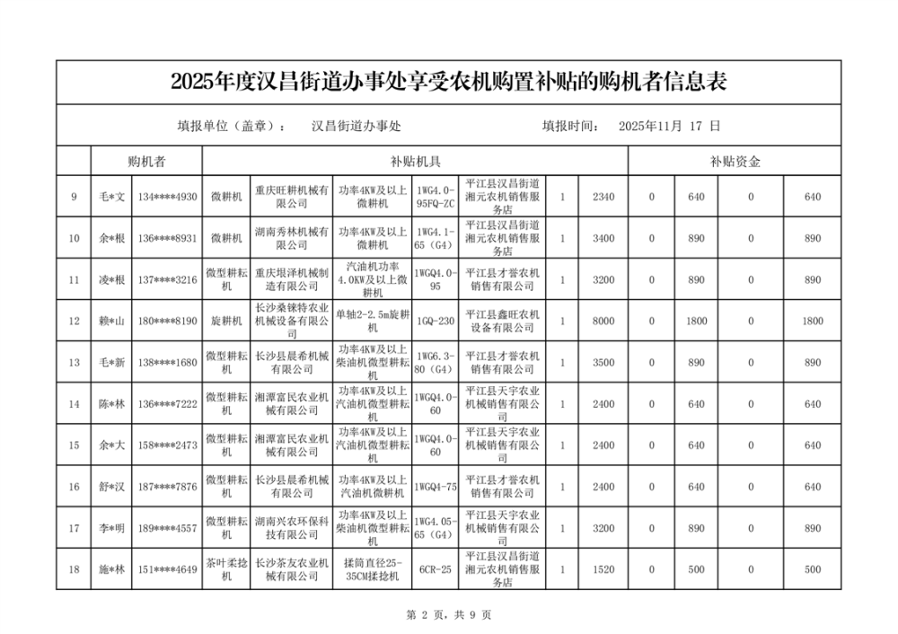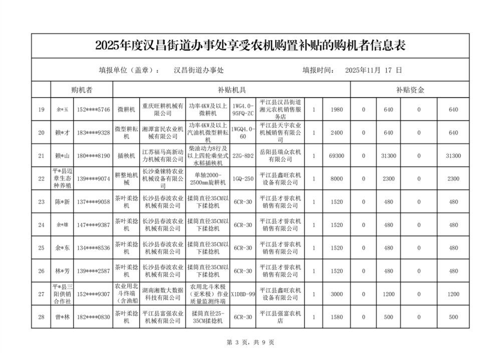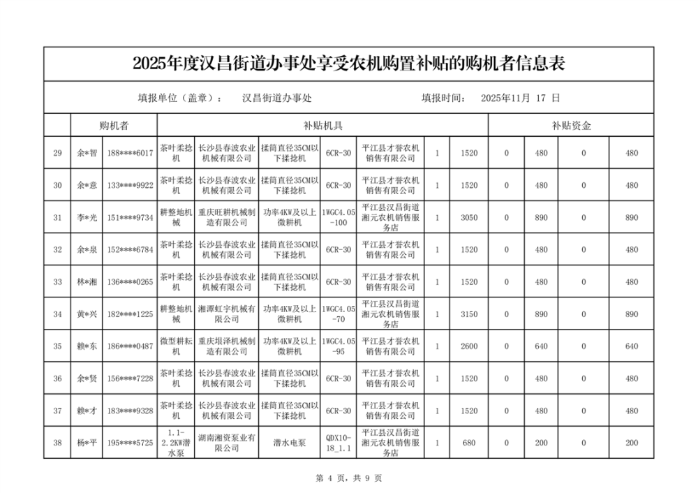 2025年度汉昌街道办事处享受农机购置补贴的购机者公示