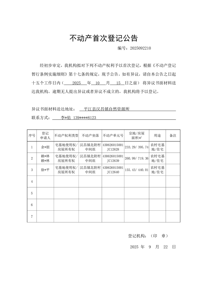不动产首次登记(余*朋等)