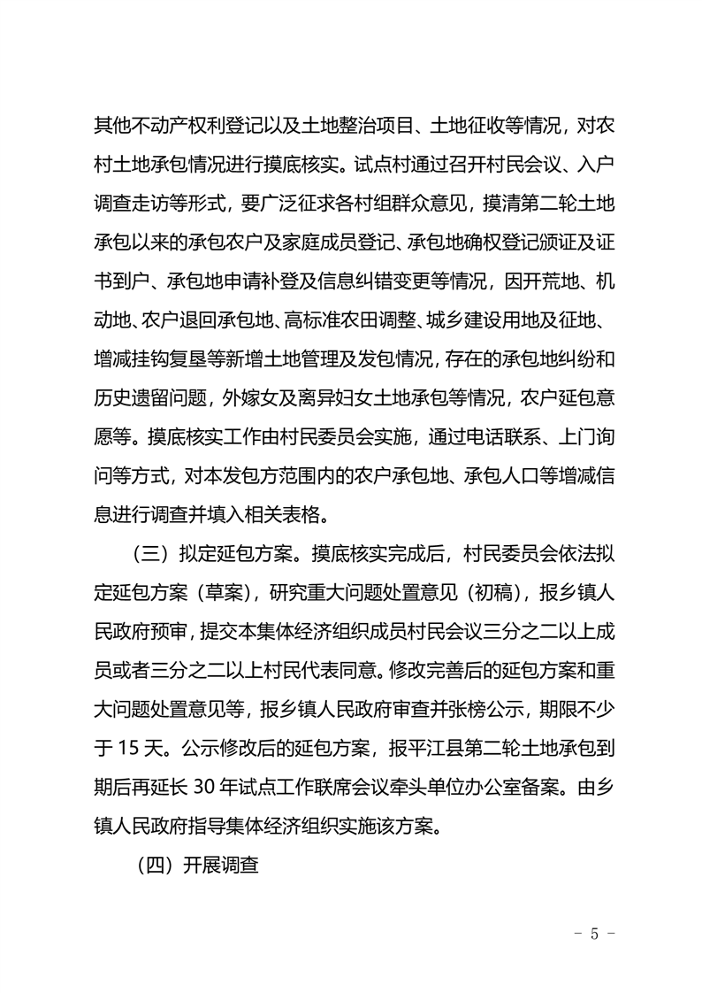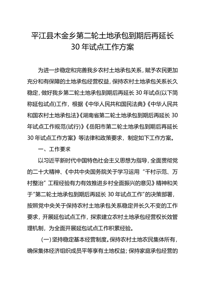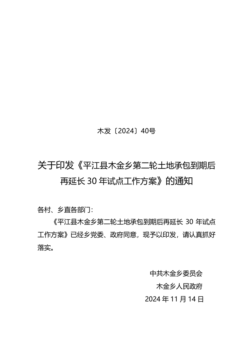 关于印发《平江县木金乡第二轮土地承包到期后再延长30年试点工作方案》的通知