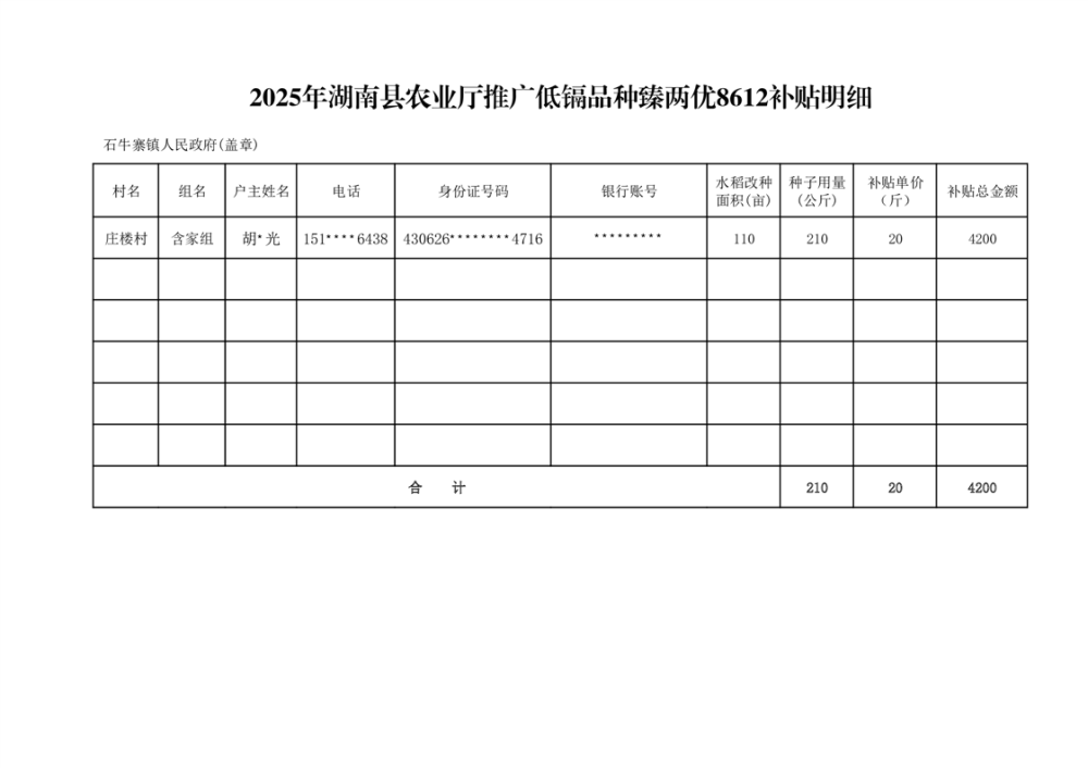 石牛寨镇2025年臻两优8612补贴资金发放明细