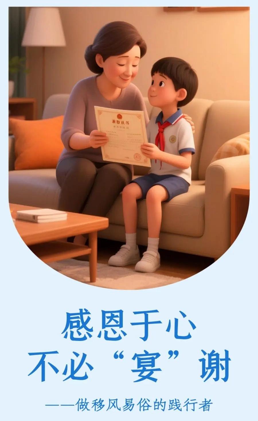 但近年来,“谢师宴”“升学宴”等宴请之风在我镇渐有抬头,大操大办、攀比摆阔的现象不仅加重了家庭经济负担,让人情往来沦为“面子负担”,更让纯粹的感恩之心、成长之喜染上了功利色彩。为破除陈规陋习,弘扬文明节俭新风,特发出如下倡议: