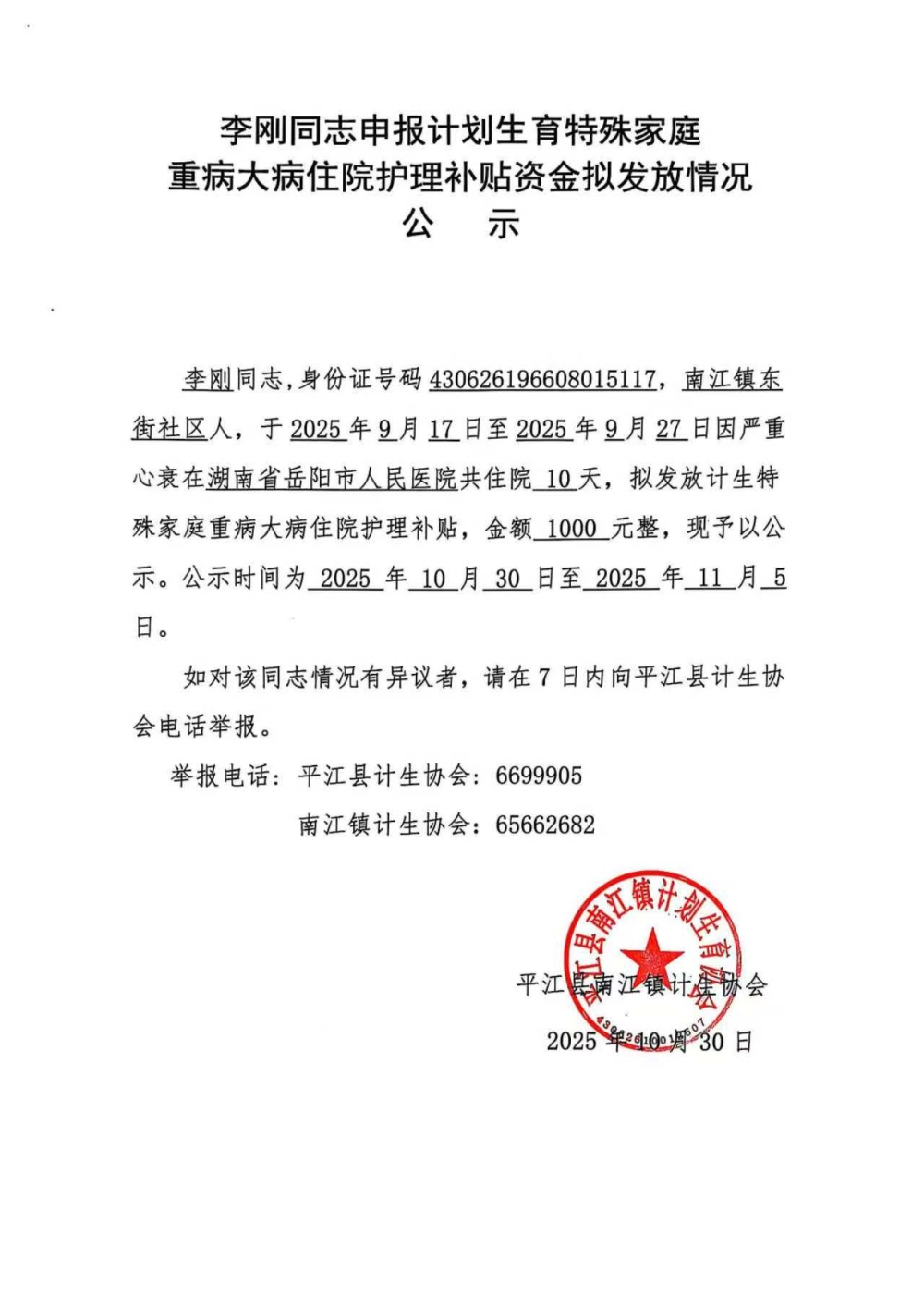 计划生育特殊家庭重病大病住院护理补贴资金发放情况公示(李刚)