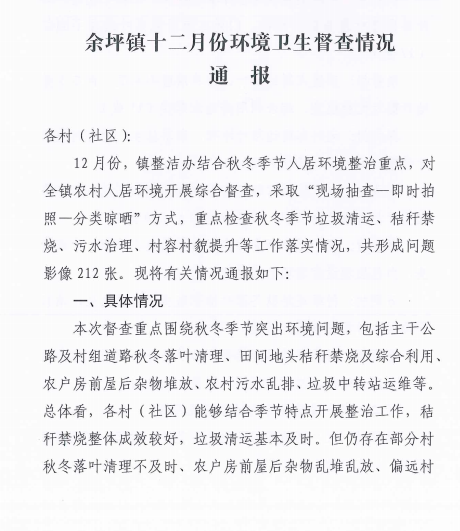 余坪镇十二月份环境卫生督查情况通报