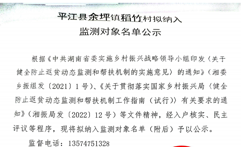 平江县余坪镇稻竹村拟纳入监测对象名单公示