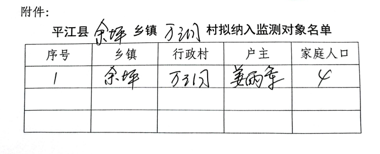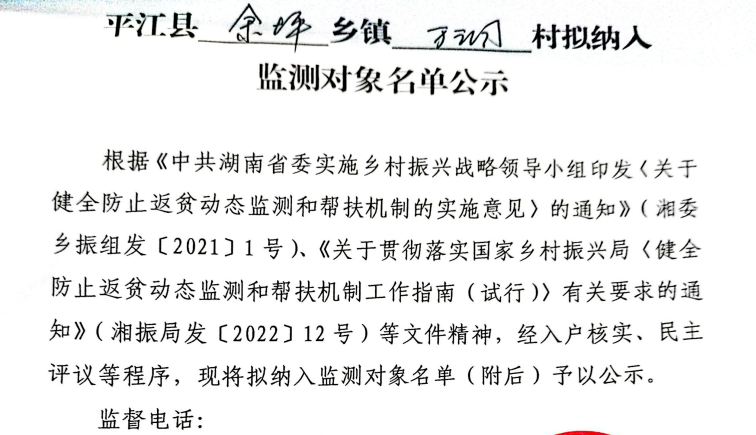 平江县余坪镇万洞村拟纳入监测对象名单公示(第一批)