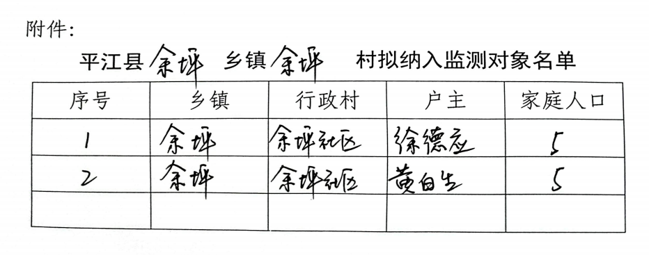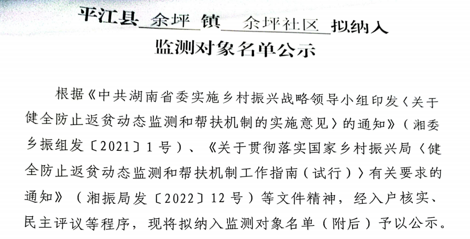 平江县余坪镇余坪社区拟纳入监测对象名单公示