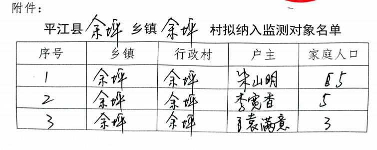平江县余坪镇余坪社区拟纳入监测对象名单公示(第三批)