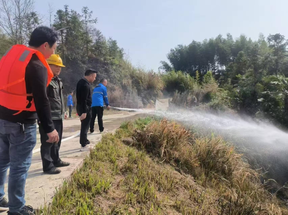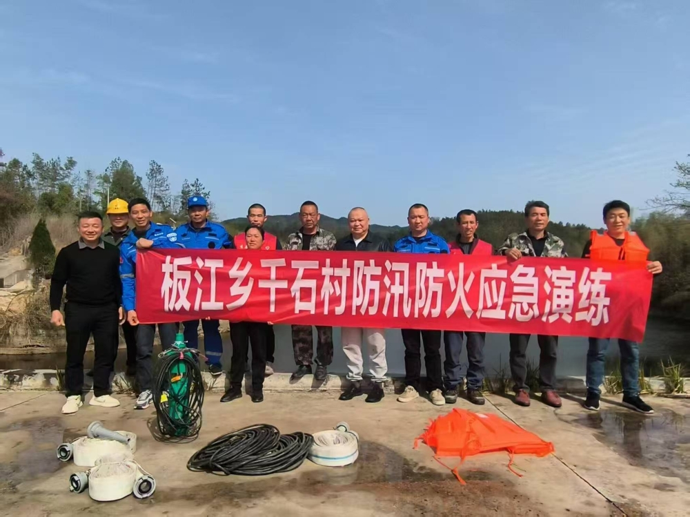 4月1日,千石村组织防火防汛应急救援队全体队员,在唐家年大山塘堤坝开展应急演练,演练以发生山火为模拟背景,一声令下,全体队员立即集合,携带村委会自行购买的消防应急设备,分成三小队,一分队将消防泵投掷到就近池塘,二分队将100米应急电源接通至最近农户家,三分队将100米消防水管连接至火灾地点,顷刻间消防管水花直冒,用时两分钟将大火扑灭。
