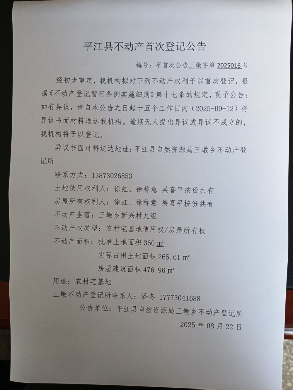 平江县不动产首次登记公告 徐虹、徐称意、吴喜平